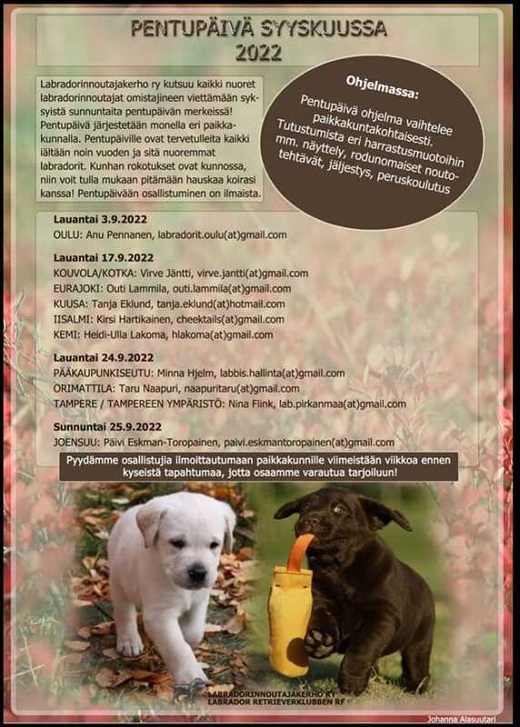 Labradorinnoutajakerho järjestää pentupäivän Tampereella 24.9.2022 klo 12. Pentupäivä järjestetään Hakametsän jäähallin hiekkakentällä.